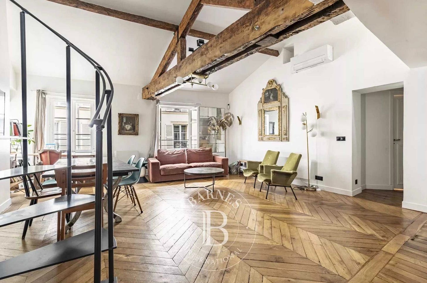 → École-Militaire/Sèvres-Babylone (metro Vaneau) • 3BR/1.1BA, 125 m2 apartment • Ask: 1.995M € • quirky, character-filled duplex apartment on building’s top floors • Annual maintenance/condo fees: 3040 € • Agent: Sarah Dulac, Barnes.