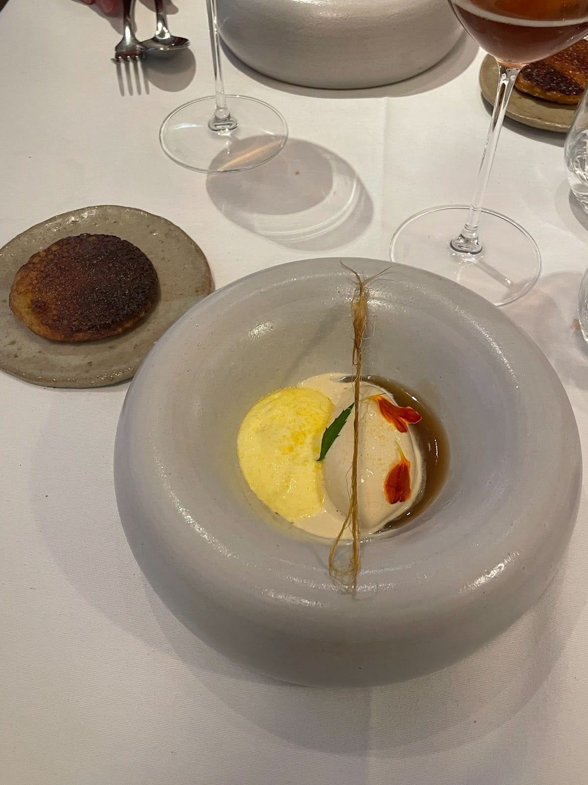 The first dish is all freshness and care: a radish and pear mille-feuille that shifts character depending on the condiment you dip it in — almond, citrus, or seaweed. It’s supported by a Riesling Grand Cru Frankstein from Léonard Dietrich, sharp and crystalline.