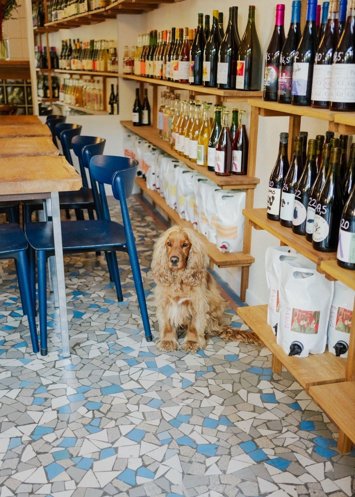At Marnes Bleues in the 19th arrondissement, they’ve stripped the space back to its essentials: raw concrete, bespoke woodwork, and the 1960s-era terrazzo tiles that give the bar its name. A sublime, rotating display window opens the bar to the park and pivots into an oyster counter in the evening.