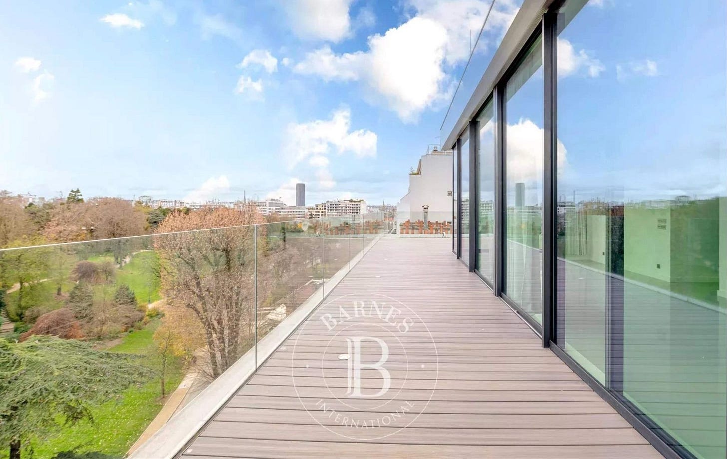 → Parc Montsouris (RER Cité Universitaire) • 3BR/2BA, 160 m2 duplex • Ask: 3.6M € • 6th floor in recently built building overlooking the park, with 90 m2 outdoor space • Annual maintenance/condo fees: 4844 € • Agent: Jerome Perbereau, Barnes.