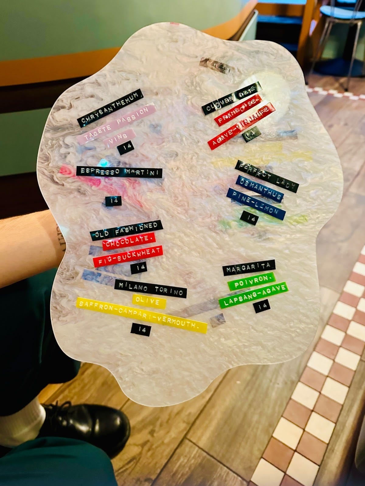 The menu is made entirely of colorful Dymo labels, tactile and playful, like notes pinned to a studio wall. The bartender labeled our names and placed them on the table like place cards. Later, they joined the others on the bar wall. A small gesture, but somehow moving.